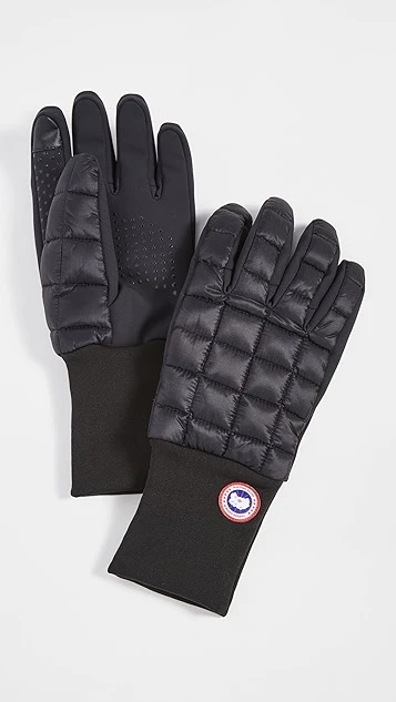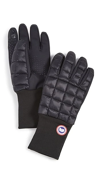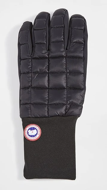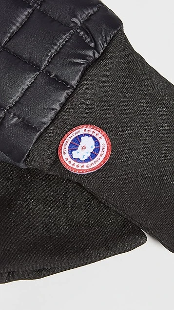 A touchscreen-friendly pair of Canada Goose gloves, carefully quilted, filled with down, and accented with a signature logo patch.