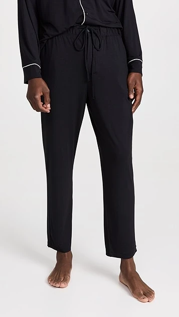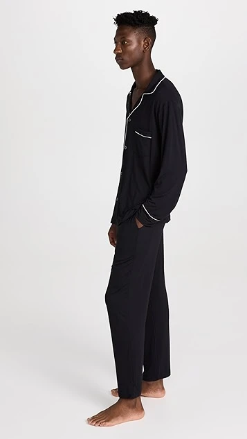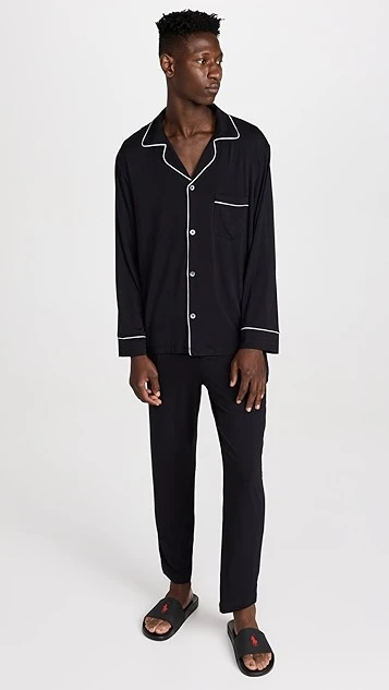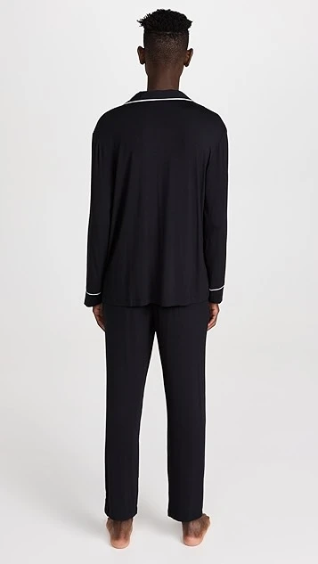 An Eberjey pajama set, rendered in soft jersey and trimmed with contrast piping for a classic, vintage-inspired touch. A notched collar frames the buttoned placket on the long-sleeved top, and the coordinating pants have a covered elastic waist.