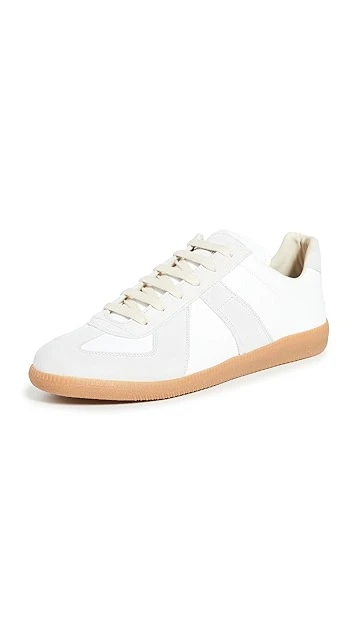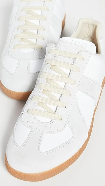 Crafted from sleek white leather and accented with contrast suede panels, these Maison Margiela sneakers are a versatile pair that look just as good with tailored trousers as they do with a laid-back pair of jeans.