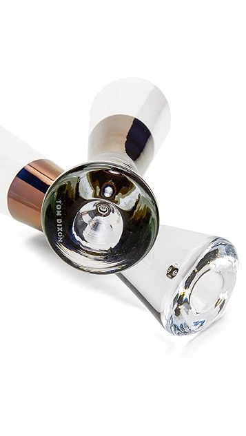 A pair of Tom Dixon champagne glasses made from mouth-blown clear glass with hand-painted copper detailing.