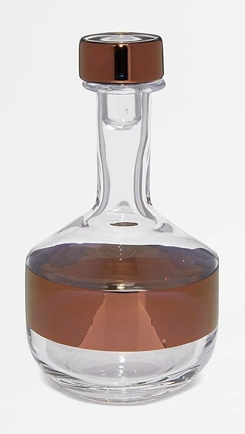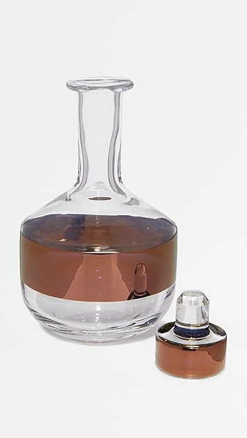 A hand-blown Tom Dixon carafe designed with a metallic finish at the ball-shaped stopper and base and a flared mouth for a careful pour.