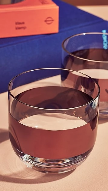 A pair of Tom Dixon lowball glasses made from mouth-blown clear glass with hand-painted copper detailing.