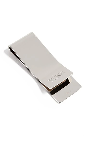 A sleek Tumi money clip, crafted from etched, high-shine brass.