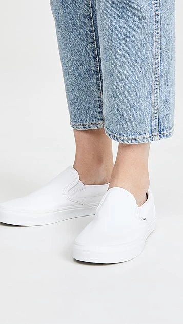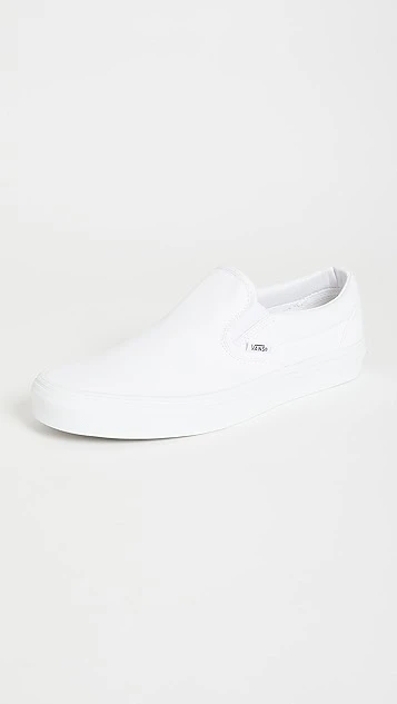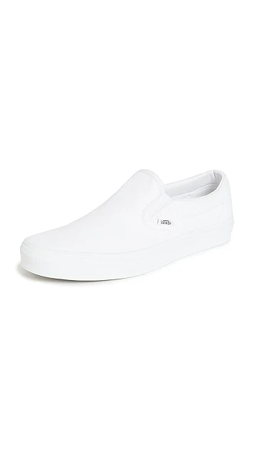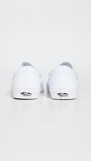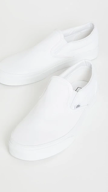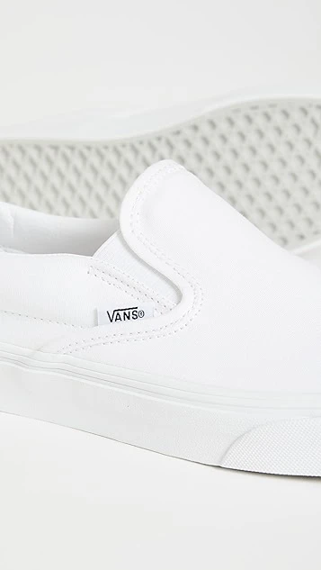 Bright-white canvas brings an understated look to these comfortable and classic Vans UA slip-on sneakers. A logo tag and heel patch add a signature finish.